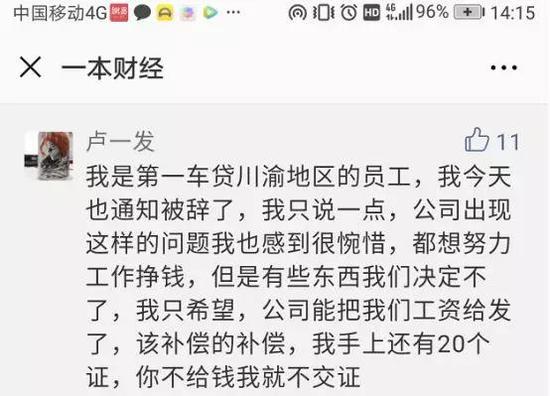 一位网友在一本财经文末留言称,我是第1车贷川渝地区的员工,我今天也被通知辞退,他为公司出现这样的问题感到惋惜,但有些东西自己决定不了,只希望公司把工资发了,并给与相应的补偿,否则不上交拿在手里的20个证。