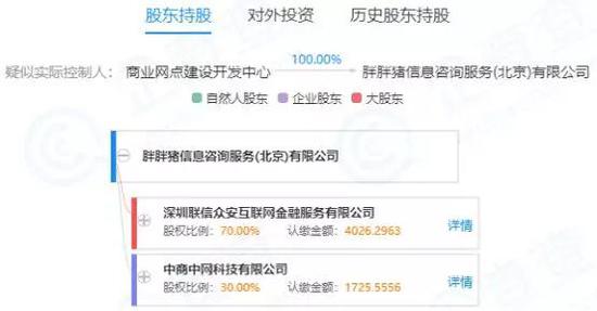 公开资料显示,胖胖猪隶属于胖胖猪信息咨询服务(北京)有限公司。工商资料显示,胖胖猪成立于2011年3月11日,注册资本5752万元,法人代表王凯,股东是深圳联信众安互联网金融服务有限公司(持股70%)、中商中网科技有限公司(持股30%)。