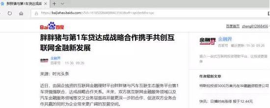 2018年11月30日,胖胖猪宣布与第1车贷达成战略合作,并在官网及媒体发布新闻稿。不过,可能受第1车贷资金链断裂消息影响,目前胖胖猪官网已将相关新闻删除。但金融界百家号转自“时光头条”的新闻还在。